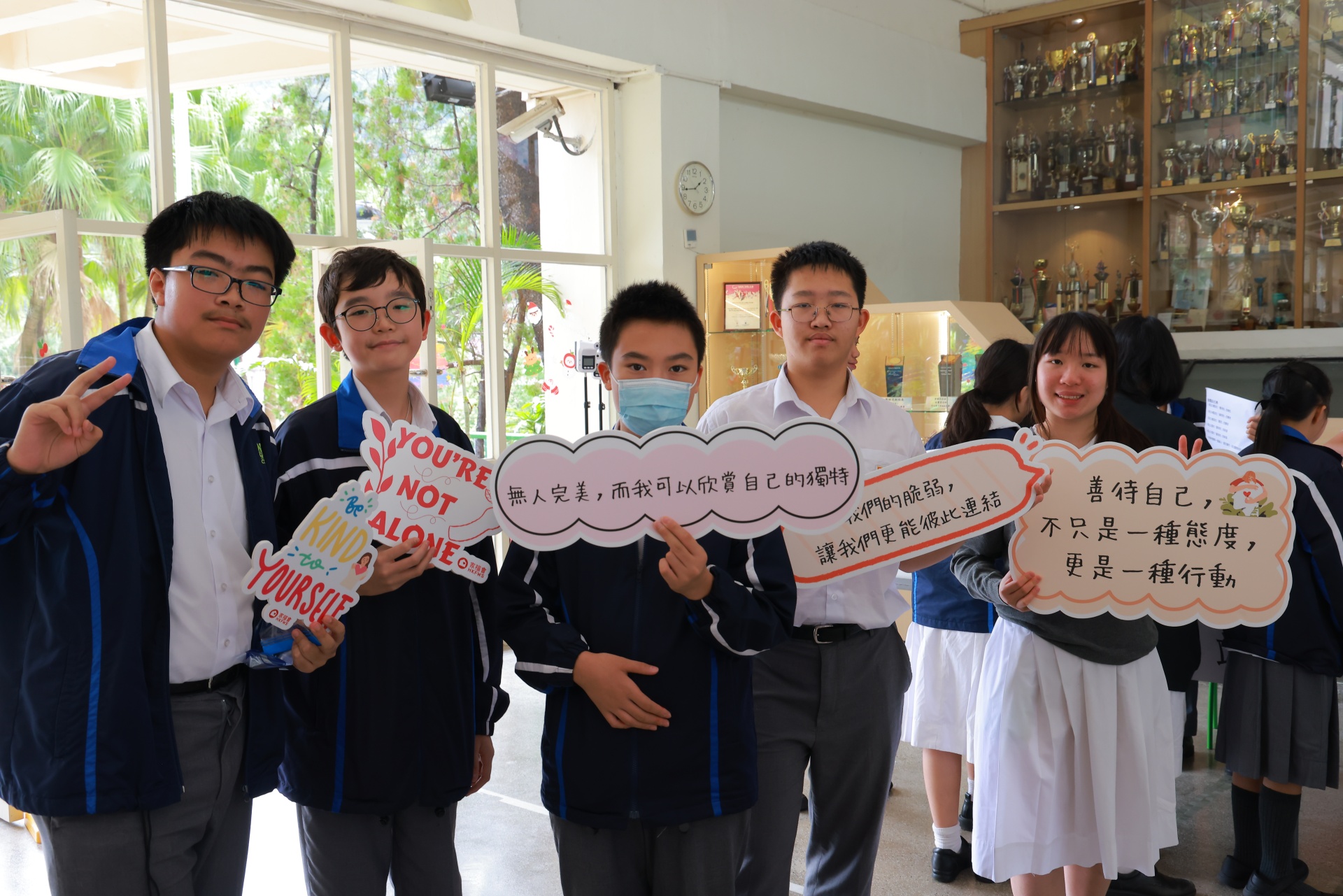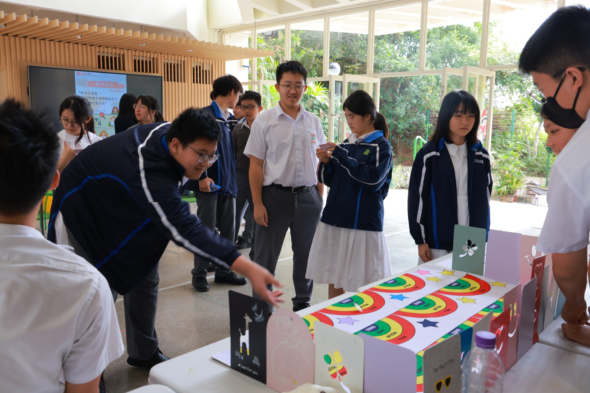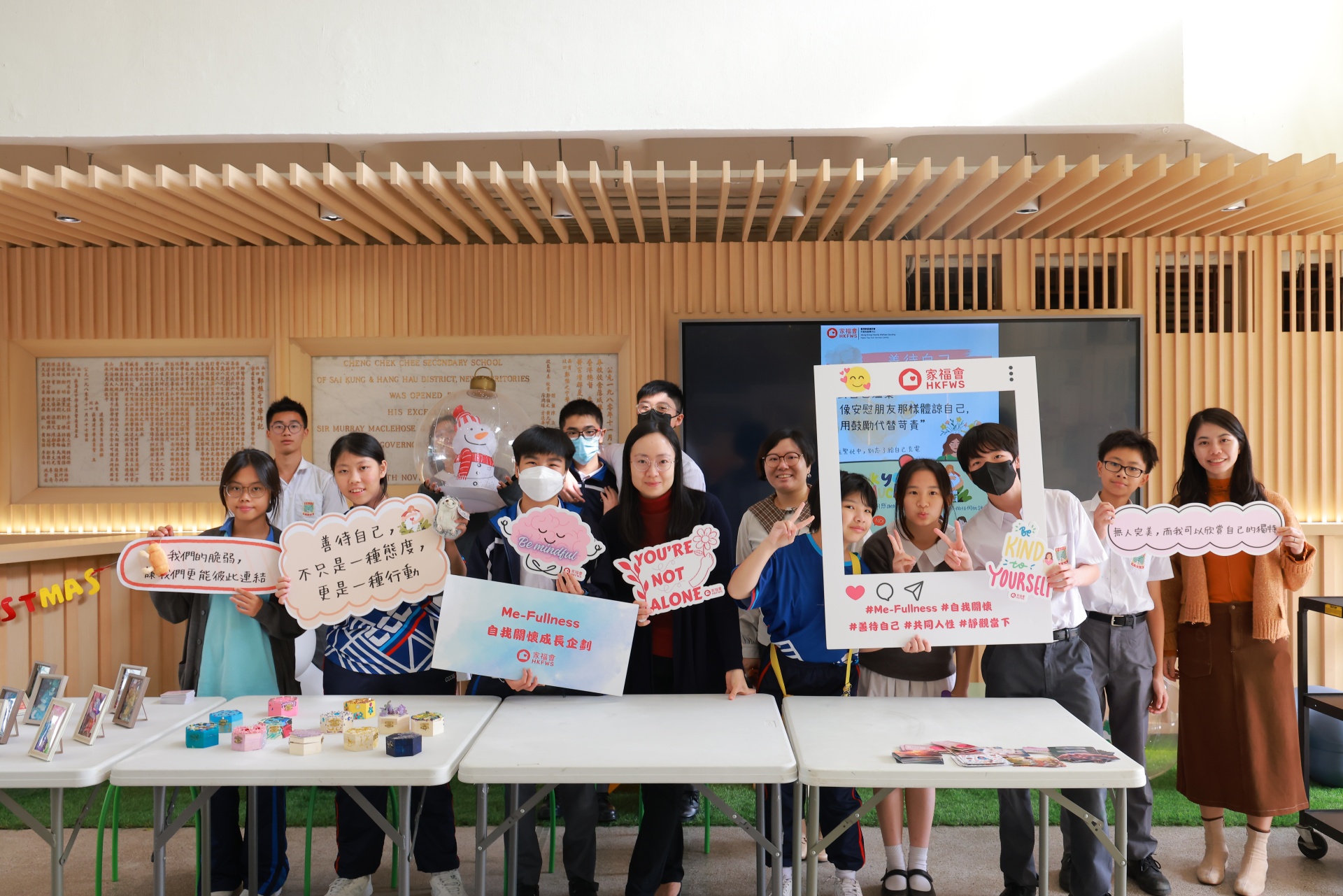 「自我关怀推广大使训练计划」为本校活动节的其中一项活动。这天,一班自我关怀推广大使于午间摆设摊位活动,除了展示他们于活动中设计的艺术品外,更借此宣扬自我关怀的重要性。同场亦设有静观挑战站,让同学借着静观训练,提升自己对精神健康的觉察。当天人龙络绎不绝,师生一同渡过了一段疗愈心灵的午后时光。