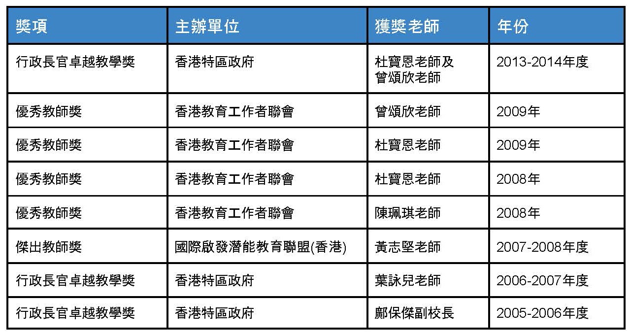 本校教師連續多年獲教育局及其他教育機構頒發獎項,教學質素得到各方面肯定。所得獎項包括教育局「行政長官卓越教學獎」、香港教育工作聯會「優秀教師獎」及國際啟發潛能教育聯盟「傑出教師獎」等。