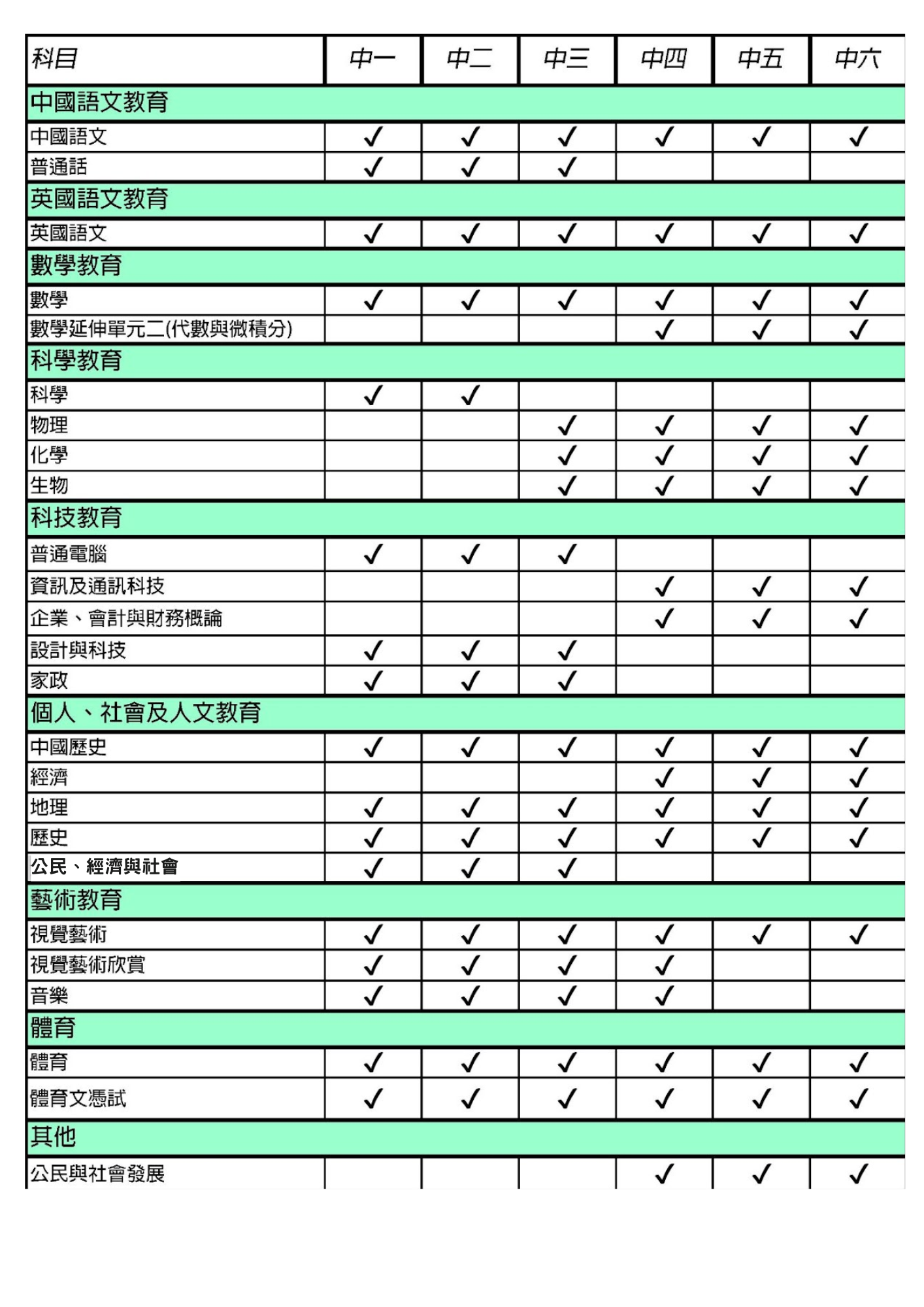 各級開設科目